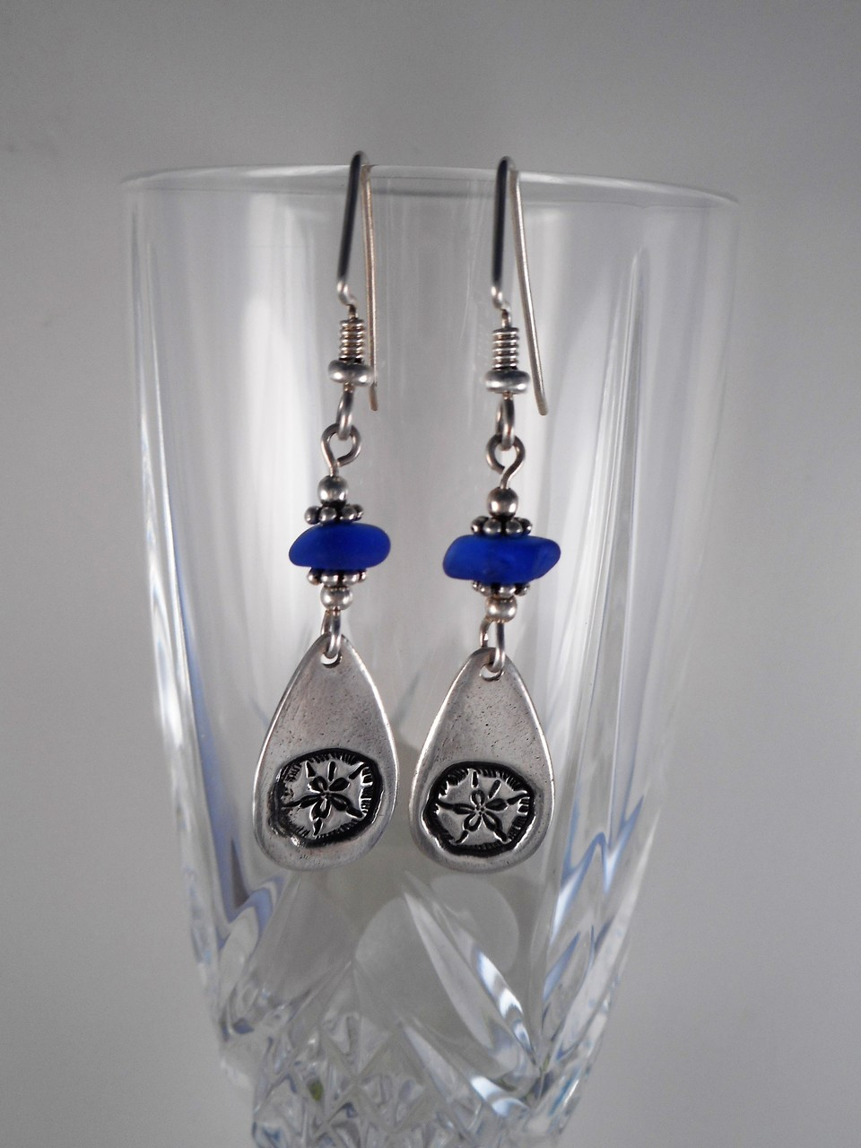 Loading... Please wait...These cute sand dollar earrings are had created by me from fine silver PMC. There are two beautiful pieces of colbolt blue genuine sea glass to compliments these cute earrings. They are 2-1/4 inches and the wires are sterling silver.
